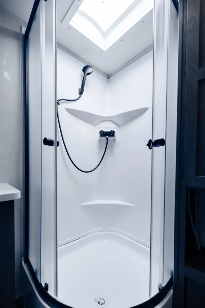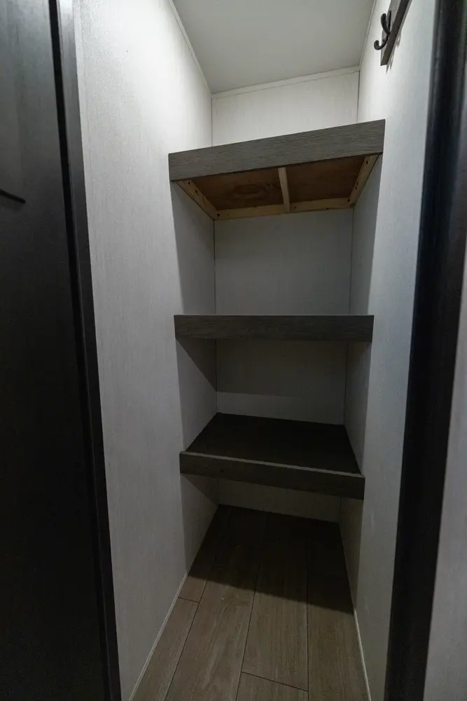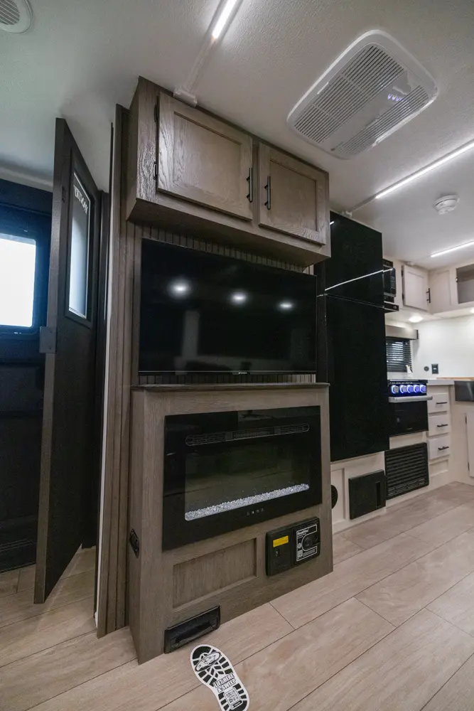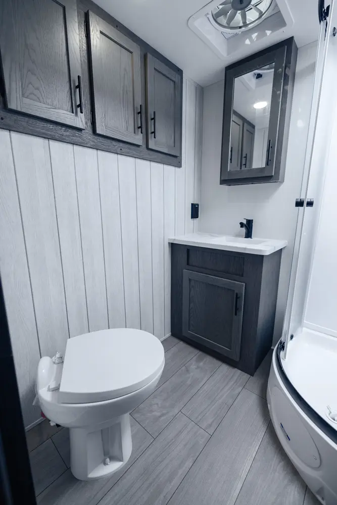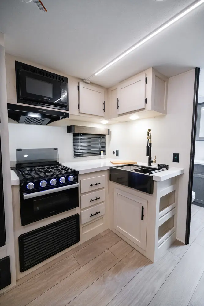 Perfect for solo campers and couples alike, the Alpha Wolf 25RB by Forest River is highlighted by a spacious rear bathroom that has plenty of storage. The kitchen is well thought out and features a hidden pantry, 12-volt refrigerator, farm style sink, oven and microwave. The dinette doubles as an extra bed when not in use and provides good seating space along with the theatre seats in the living area. Relax in the bedroom with a queen size bed, ample wardrobe space and a laundry chute.