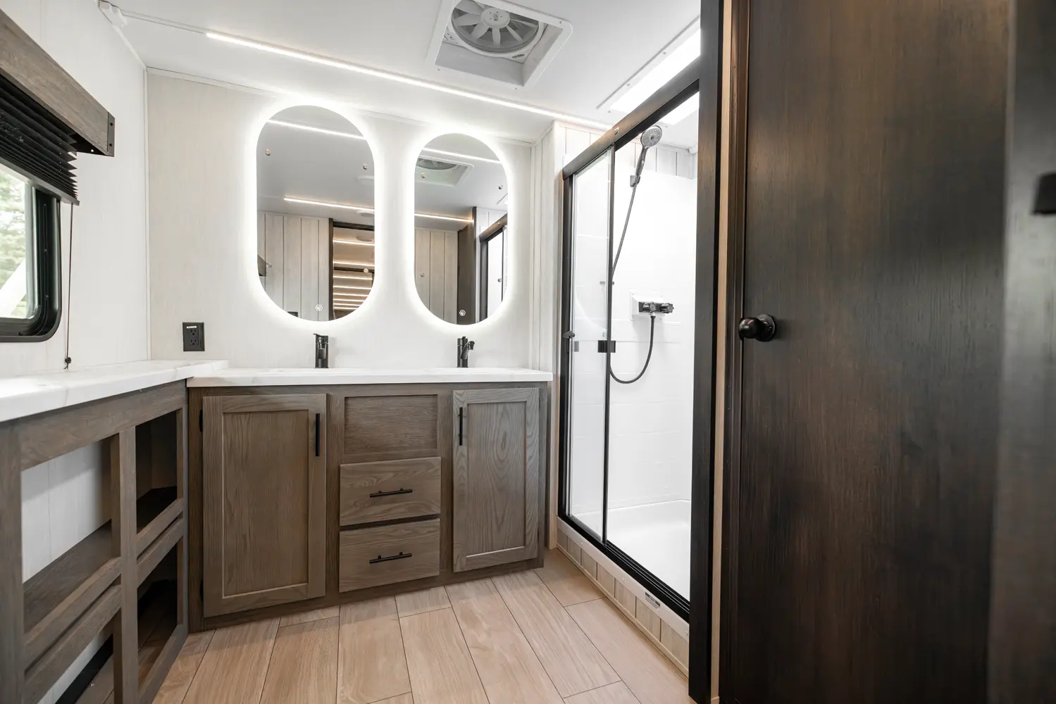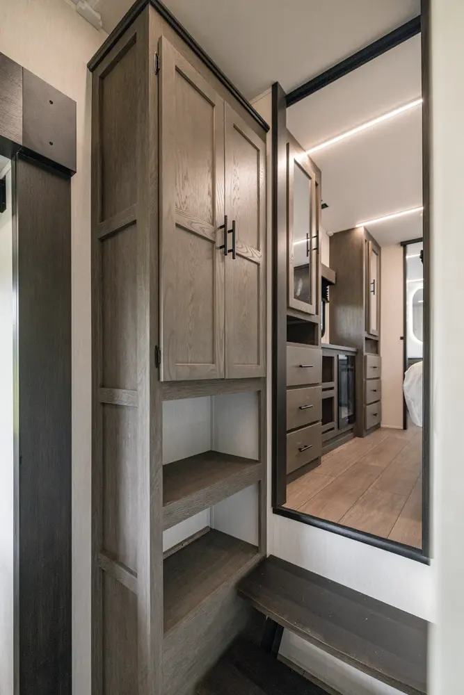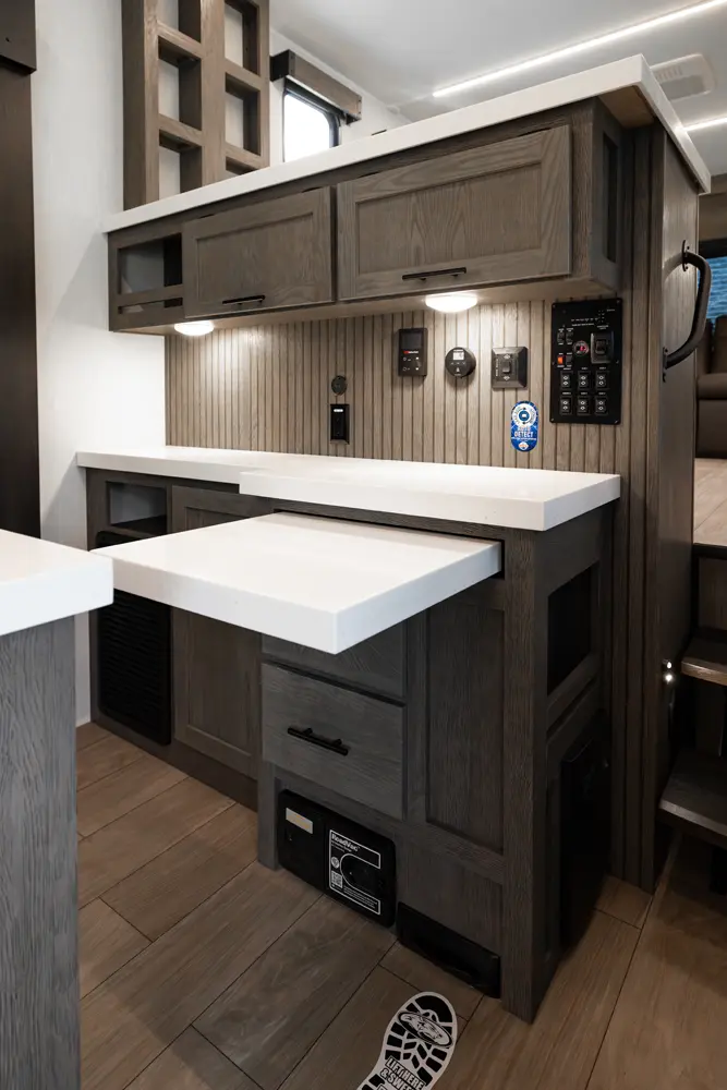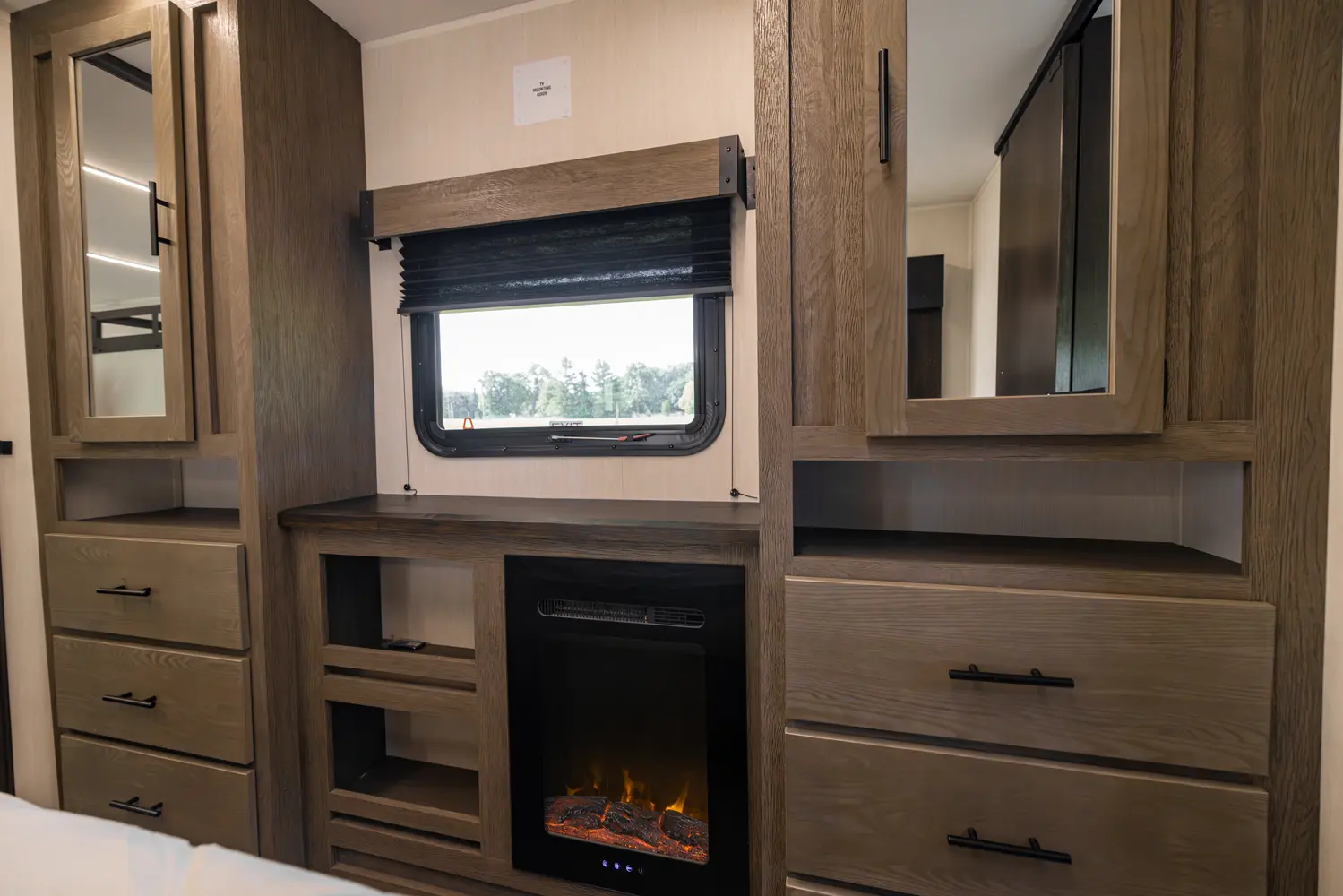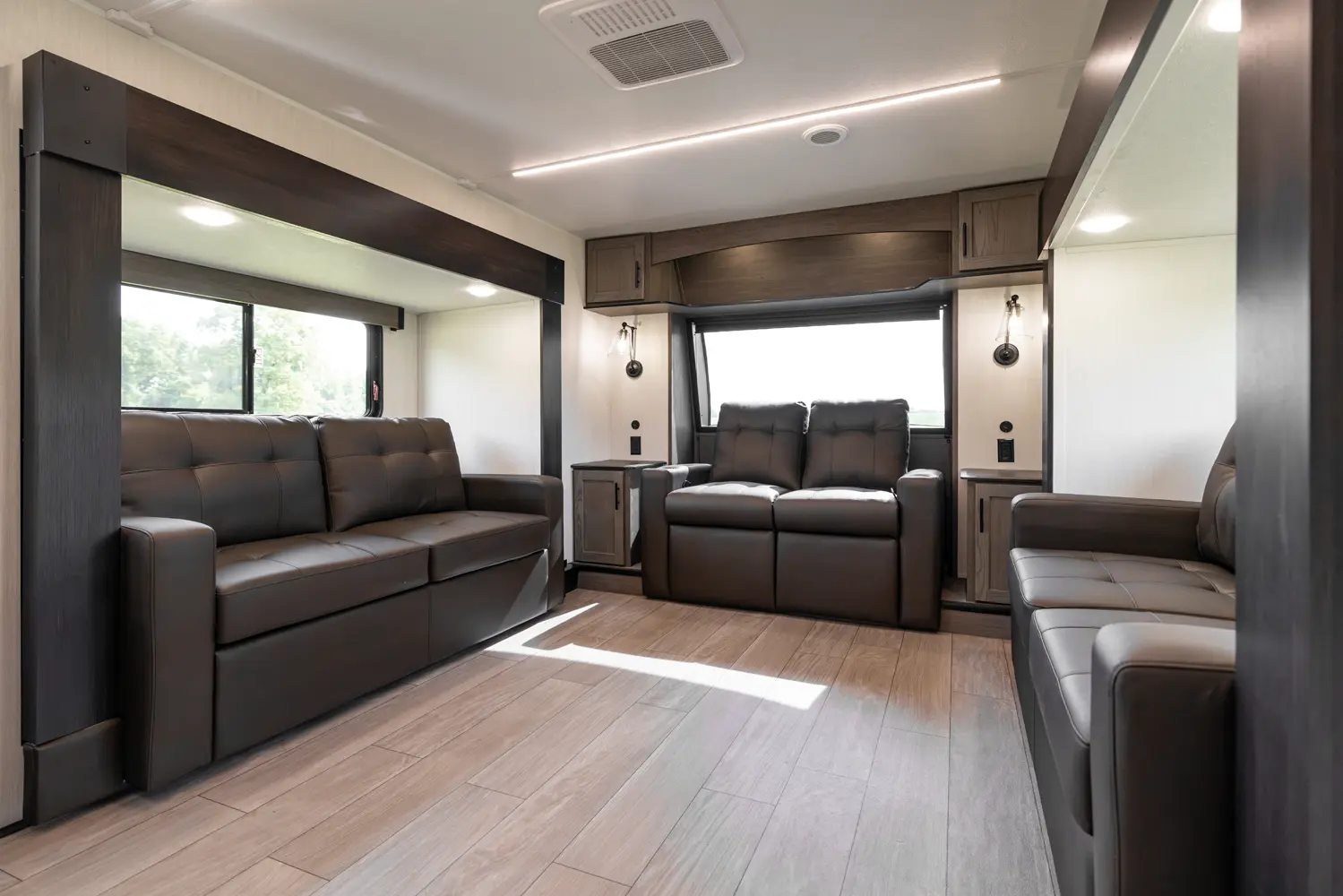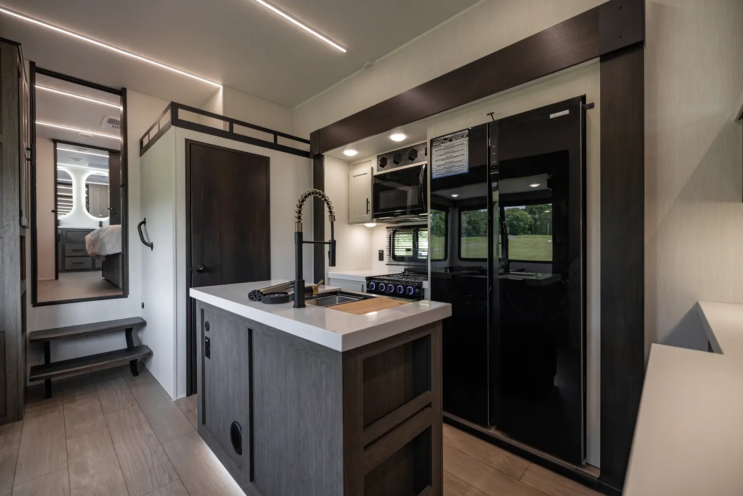 If you enjoy entertaining guests, you're going to love the Arctic Wolf 3950SUITE by Forest River! Our front living room features two tri-fold sleeper sofas and relaxing theatre seating directly across from the cozy fireplace. The island kitchen is highlighted by two 10 cu. ft. refrigerators, 30" microwave, oven, dinette seating and a half bathroom. In the primary suite you'll find a king size bed, fireplace, ample wardrobe space and an incredible bathroom with washer and dryer prep.