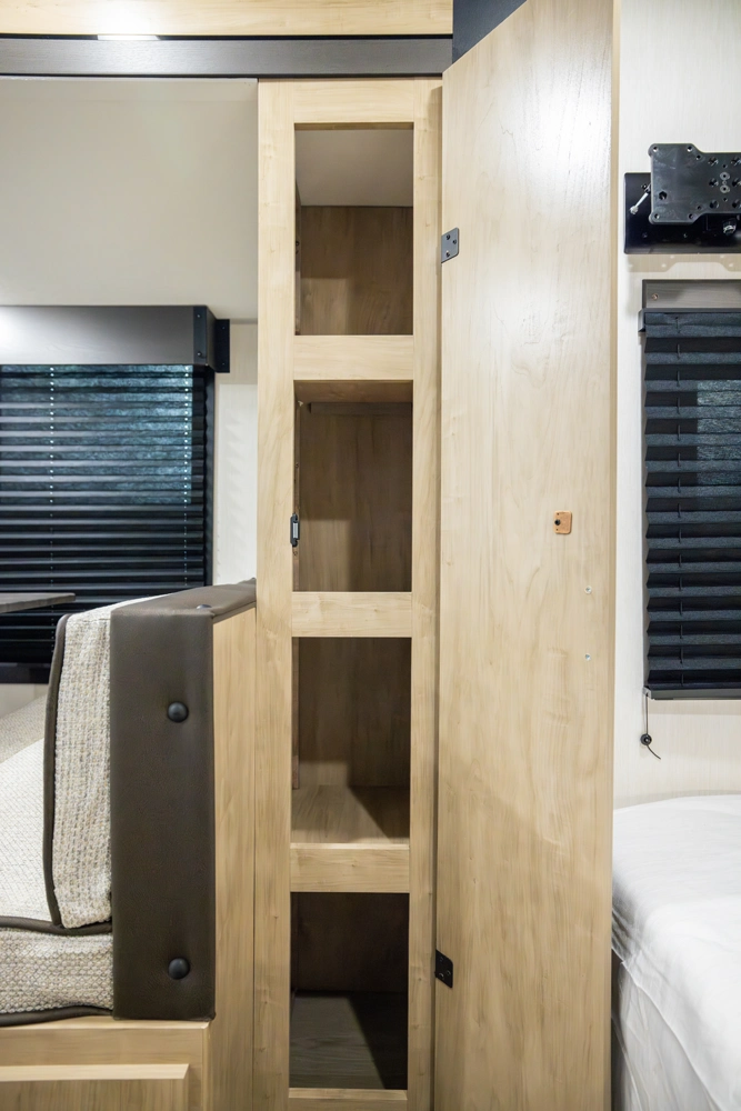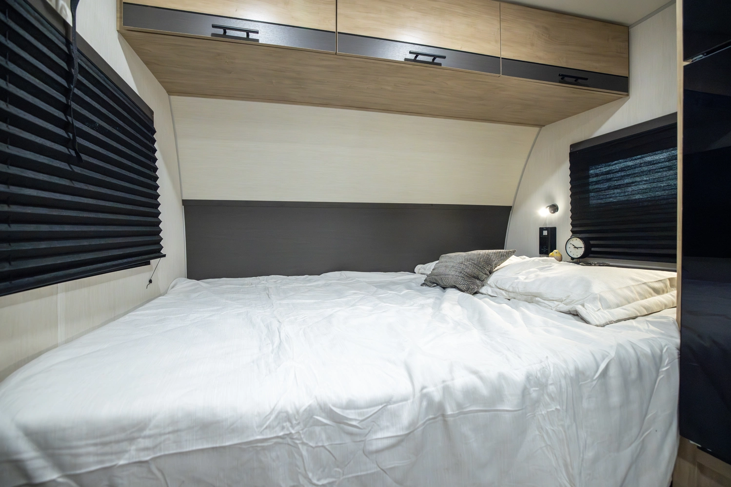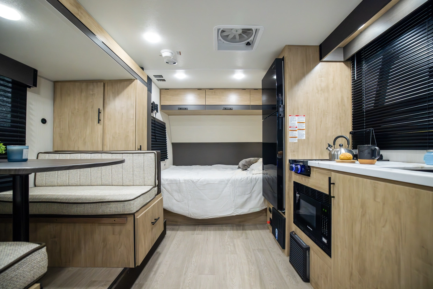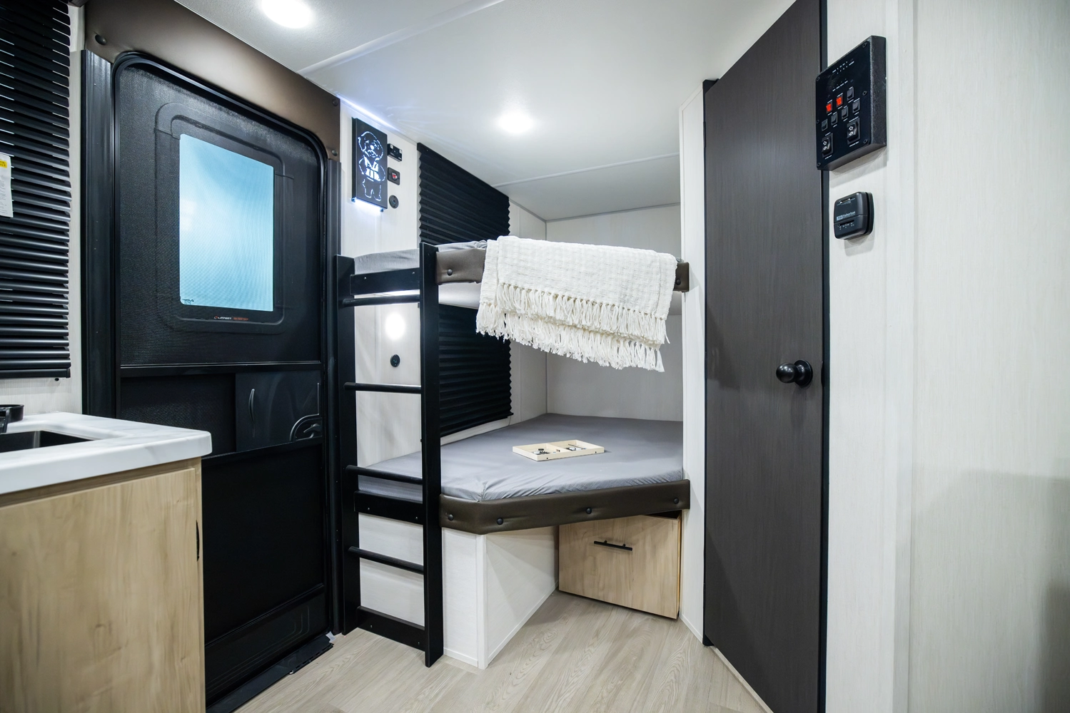 Check out one of the most lightweight, compact, and capable bunkhouse travel trailers. The 17LS can fit many people in a small amount of space and still feel comfortable and spacious. How, you ask? A queen bed with overhead cabinets makes life simple and easy for those in the primary sleeping area. In the rear bunk spot, you’ve got double-over-double bunk beds with a combined weight rating of 1.200 pounds. The bunks also feature underneath storage.