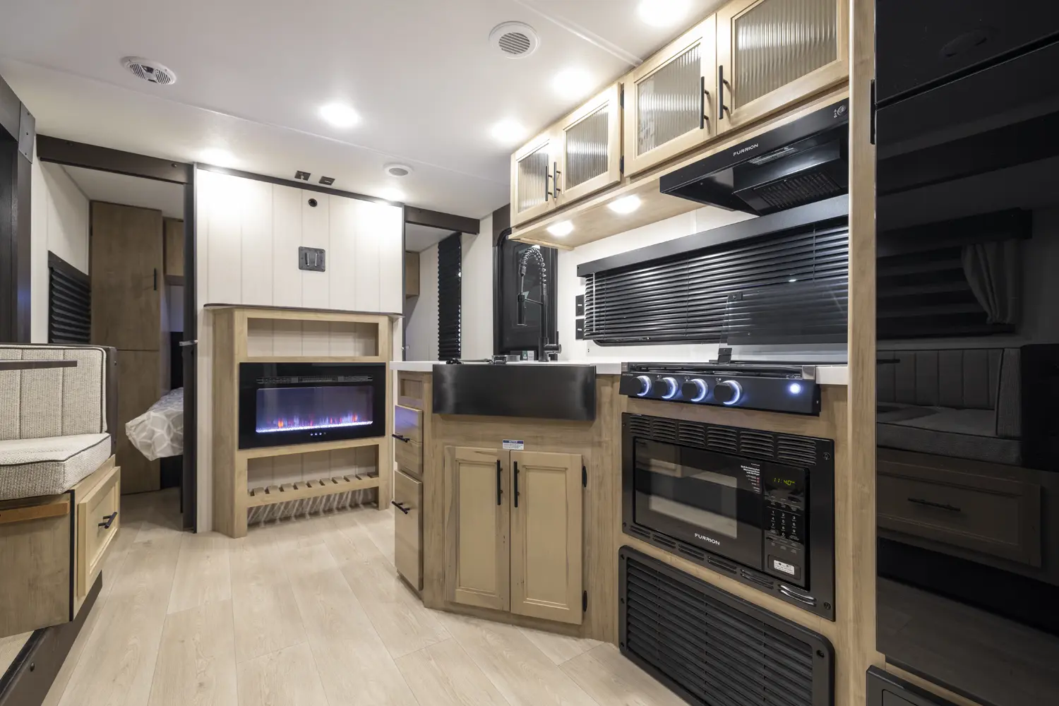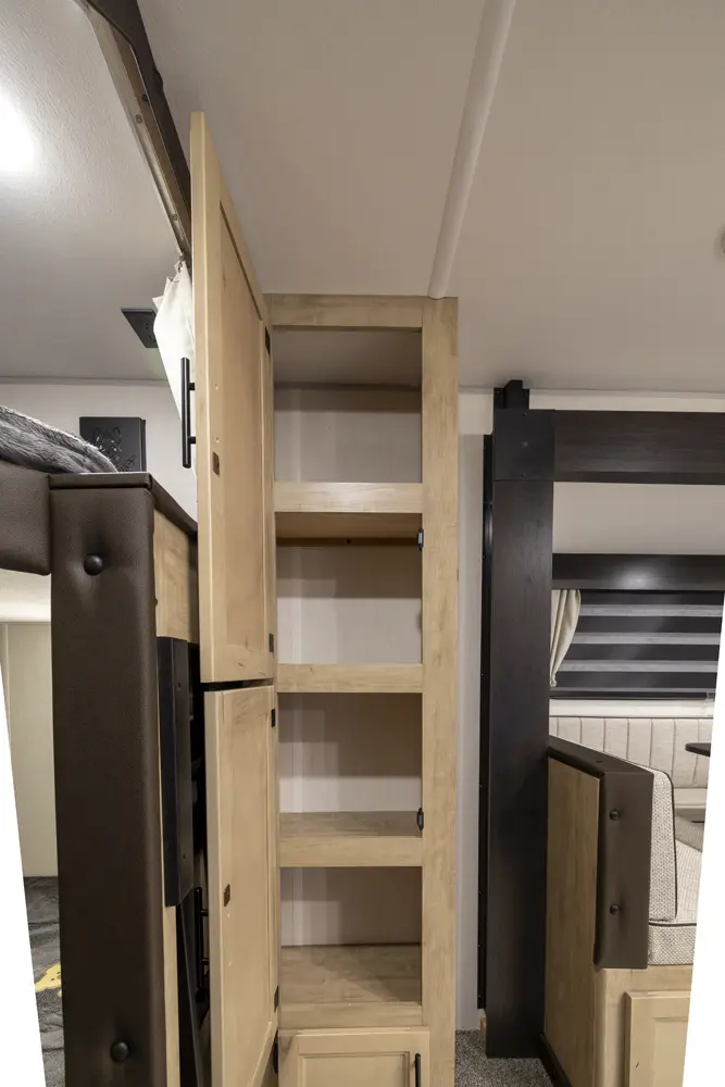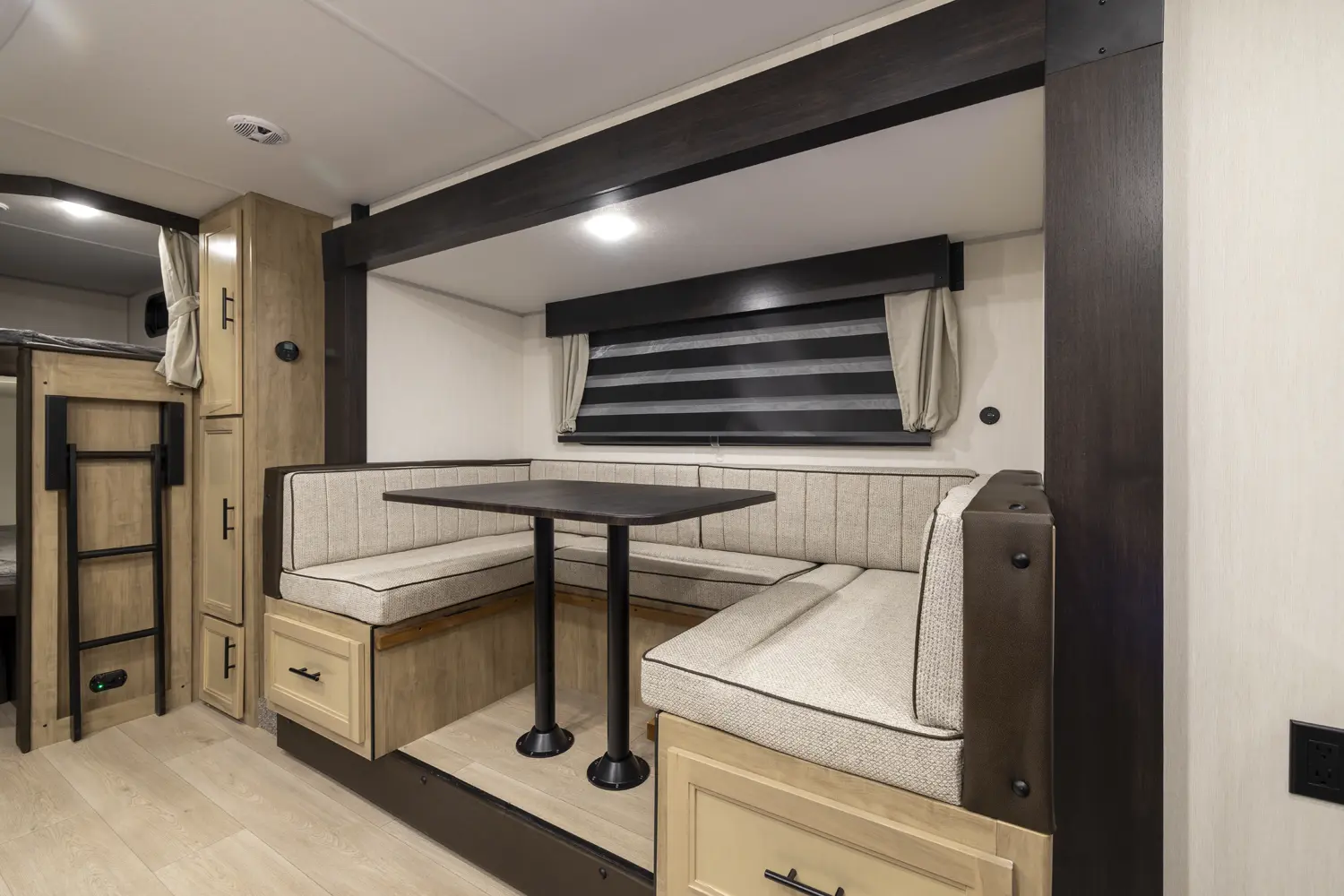 The 23DBHBL is a family bunkhouse featuring a huge double bunk with ladder for kids. The double entry doors allow easy access to the bathroom and kitchen from the exterior. The modern chef’s kitchen, oversized pantry, and extra-large U-shaped dinette with full length drawers give you more than enough storage. The private master suite provides a queen size bed with ample overhead and side cabinetry. The exterior provides under awning entertainment area with TV bracket, and outside speakers.