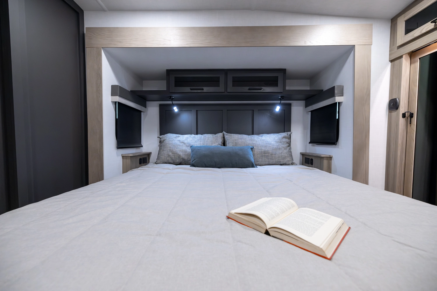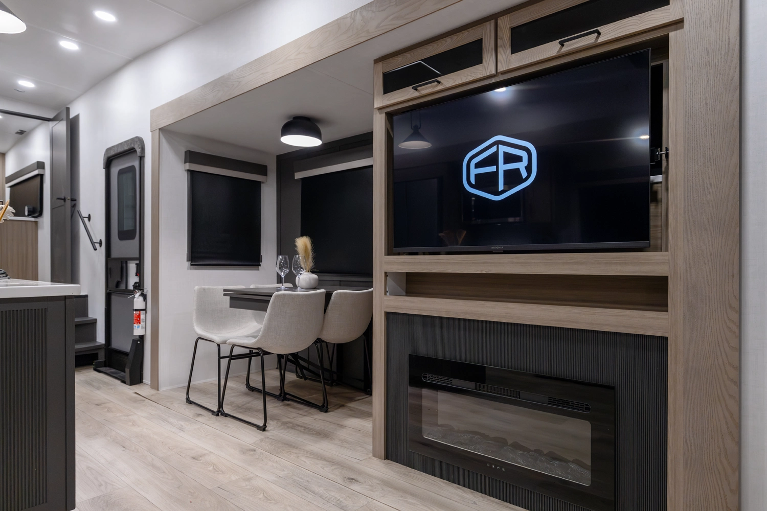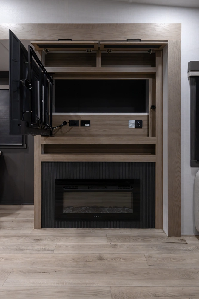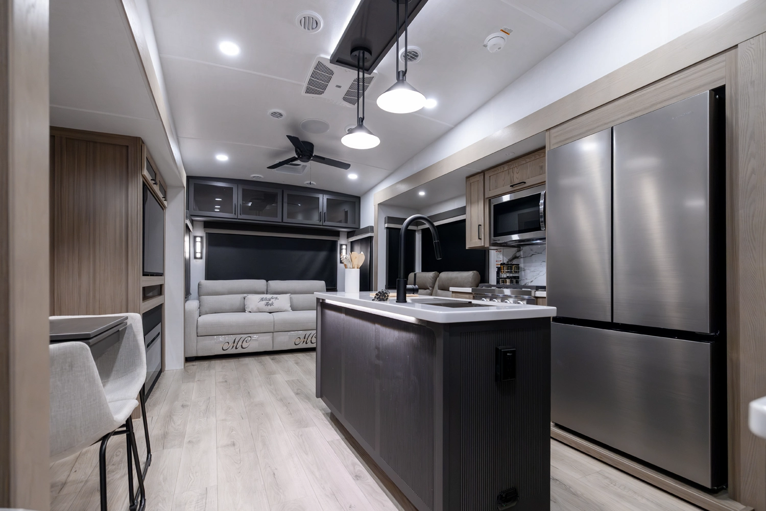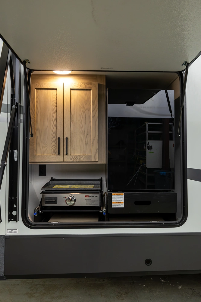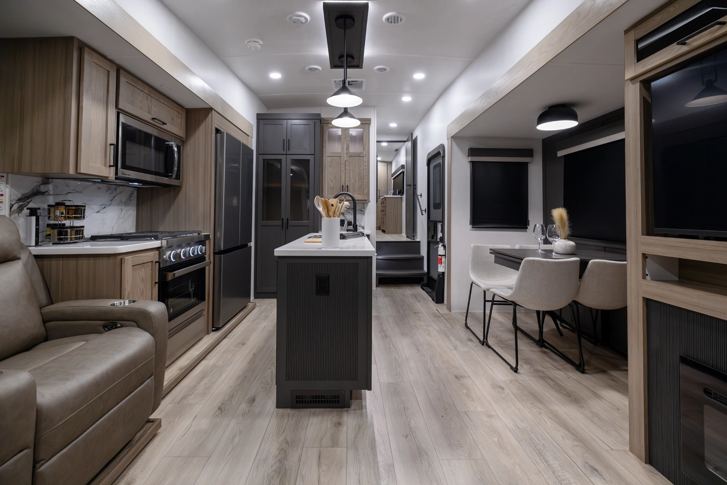 This luxurious rear living floorplan features a 78" hide-a-bed sofa, 60" theater seating, and a fireplace with TV for cozy relaxation. The spacious kitchen offers an island, pantry, and outside kitchen with griddle. The private front bedroom includes a king bed, dresser, washer/dryer prep, and wardrobes. With dual awnings, pass-thru storage, and premium finishes throughout, it’s perfect for extended stays or weekend adventures.