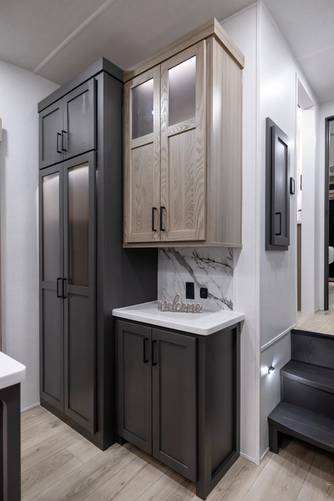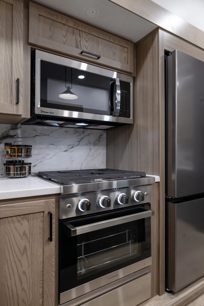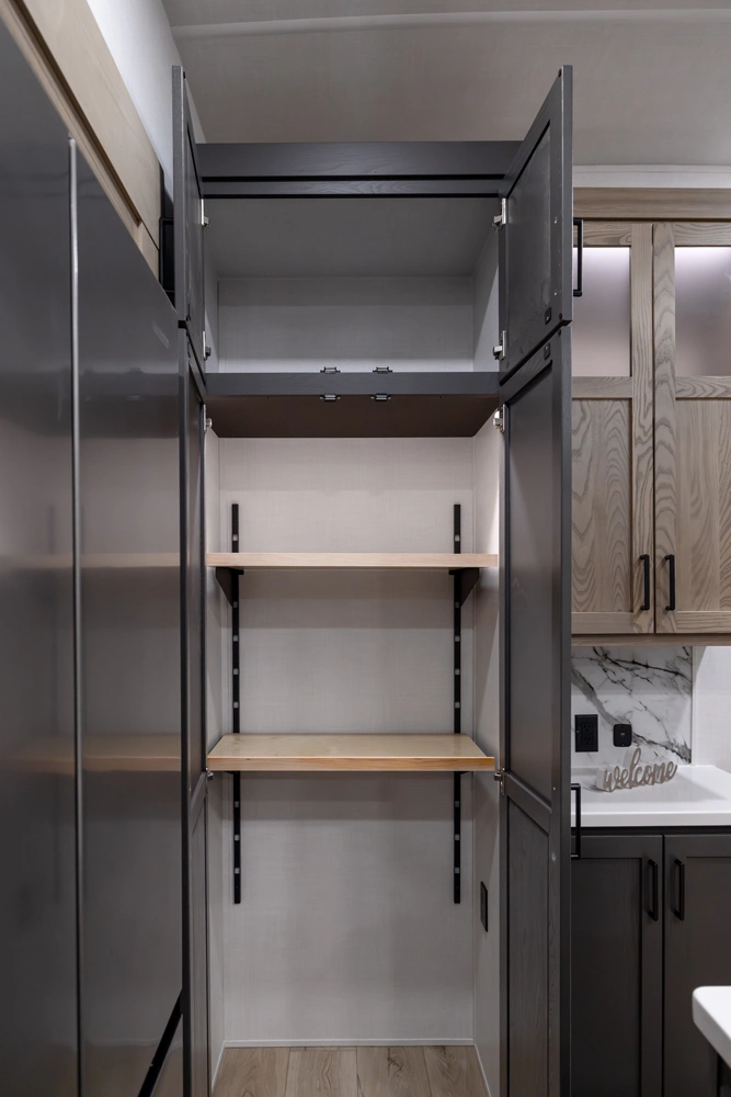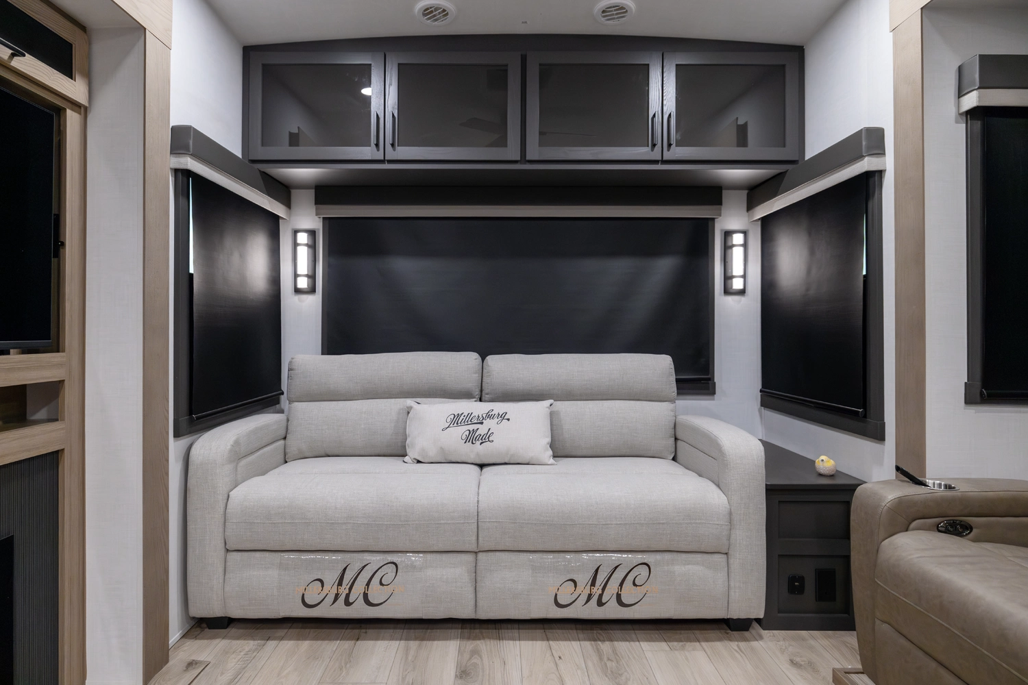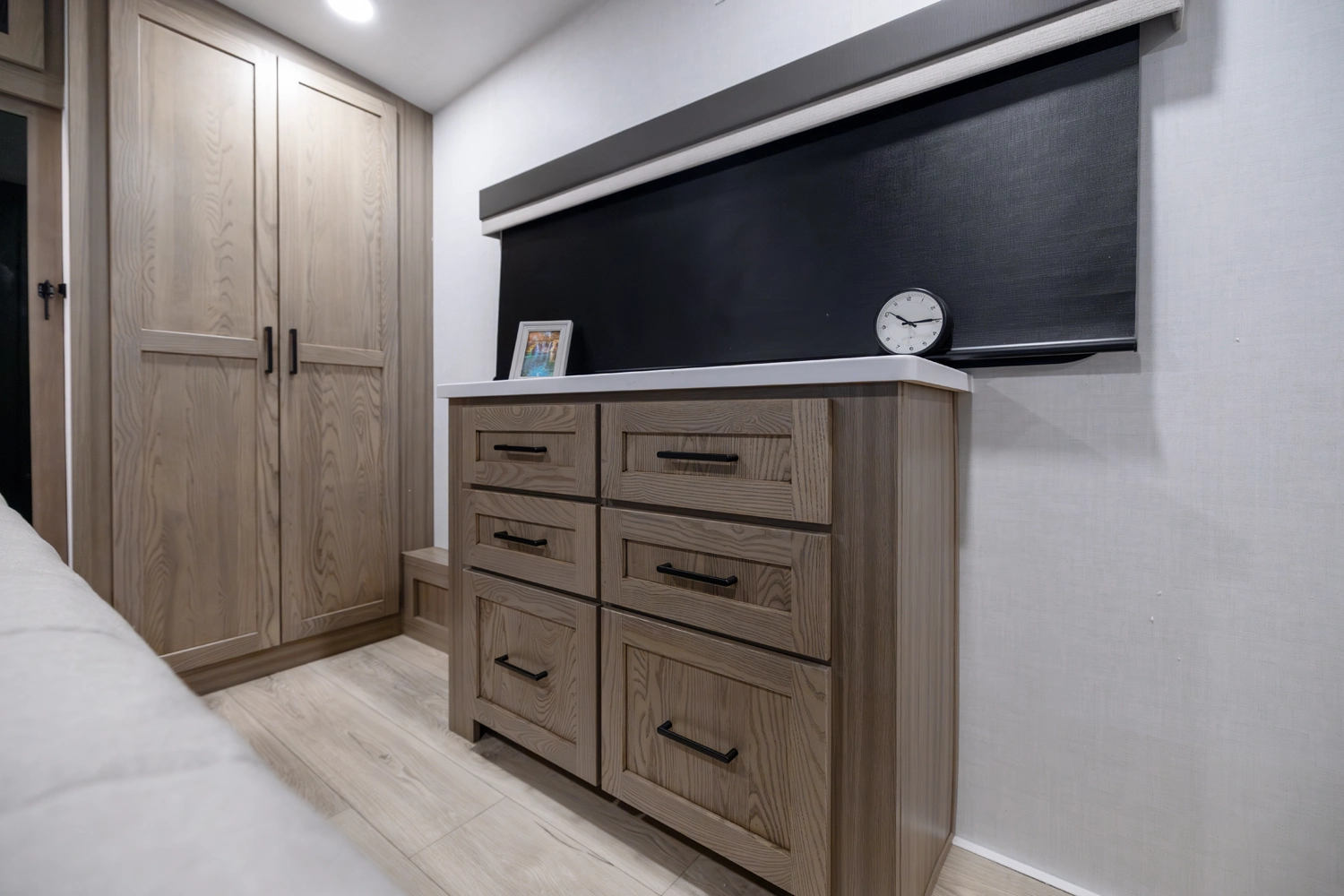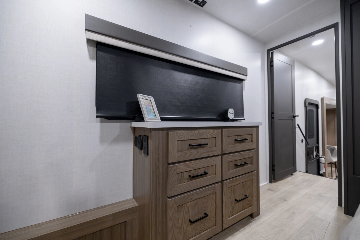 This luxurious rear living floorplan features a 78" hide-a-bed sofa, 60" theater seating, and a fireplace with TV for cozy relaxation. The spacious kitchen offers an island, pantry, and outside kitchen with griddle. The private front bedroom includes a king bed, dresser, washer/dryer prep, and wardrobes. With dual awnings, pass-thru storage, and premium finishes throughout, it’s perfect for extended stays or weekend adventures.
