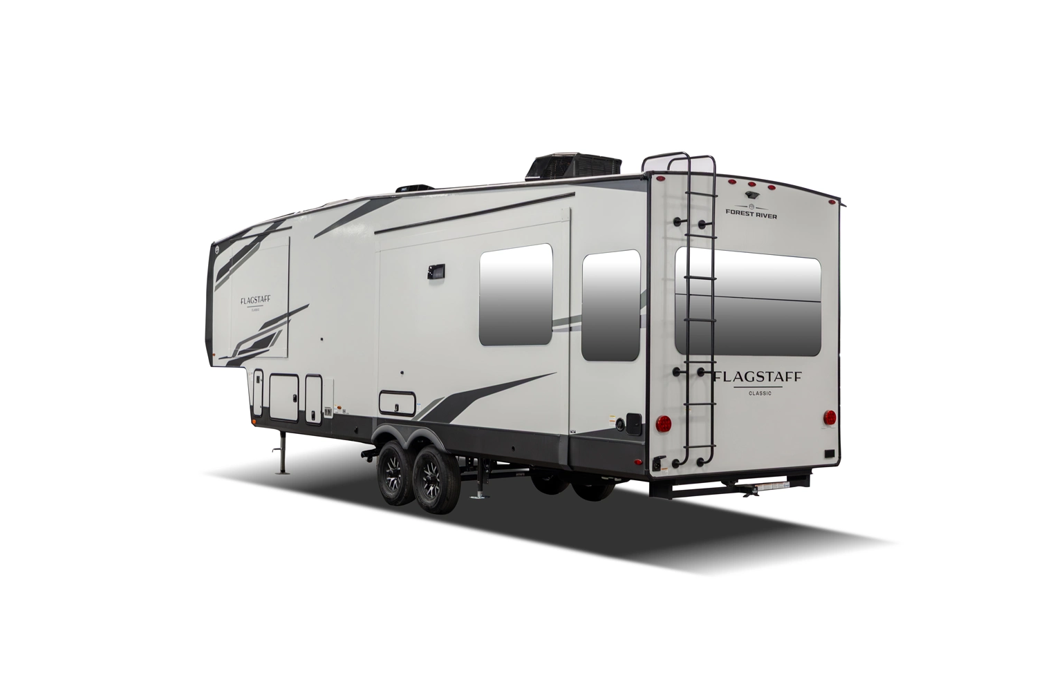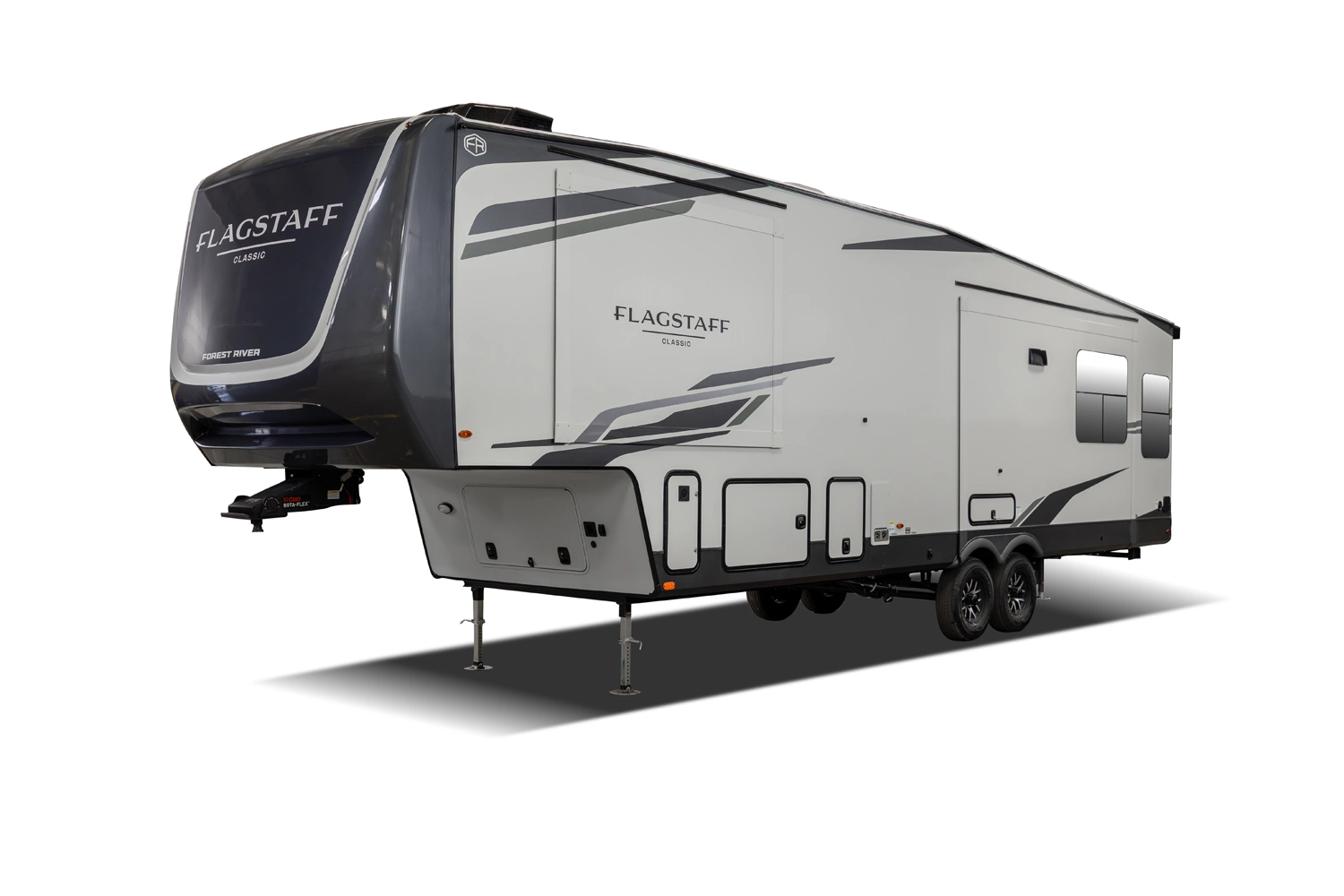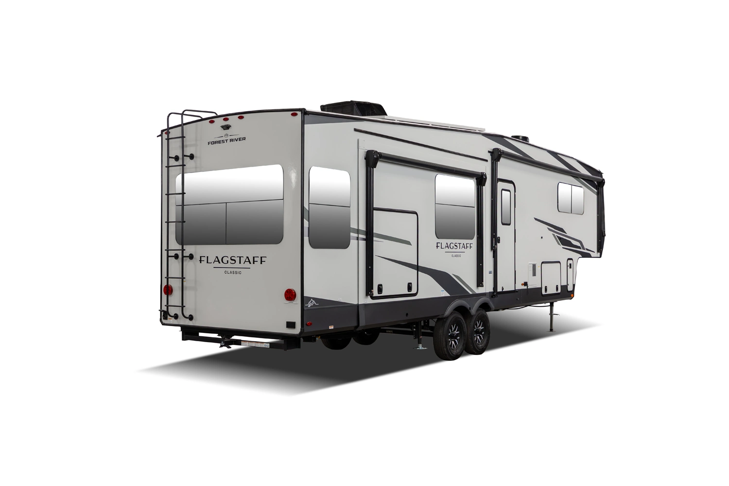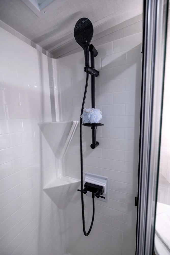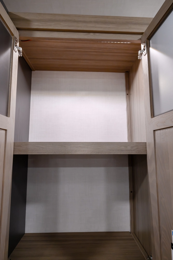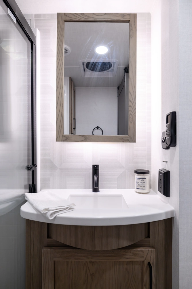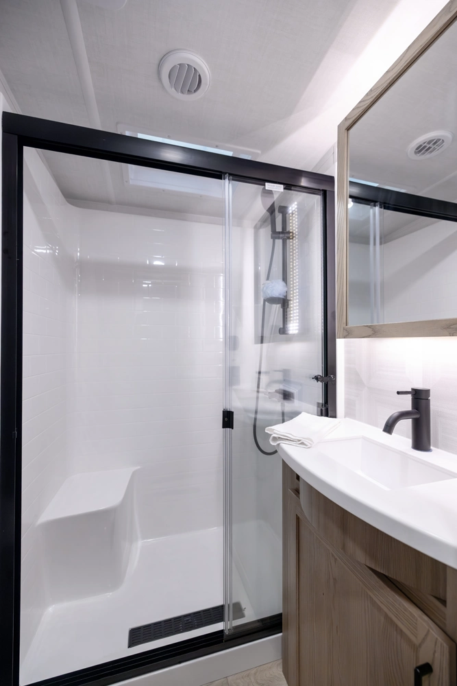 This luxurious rear living floorplan features a 78" hide-a-bed sofa, 60" theater seating, and a fireplace with TV for cozy relaxation. The spacious kitchen offers an island, pantry, and outside kitchen with griddle. The private front bedroom includes a king bed, dresser, washer/dryer prep, and wardrobes. With dual awnings, pass-thru storage, and premium finishes throughout, it’s perfect for extended stays or weekend adventures.