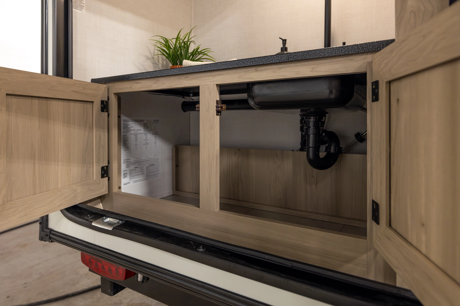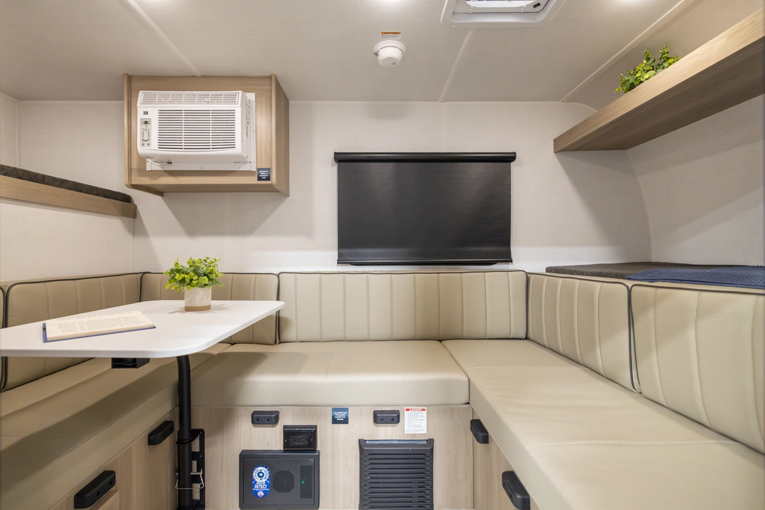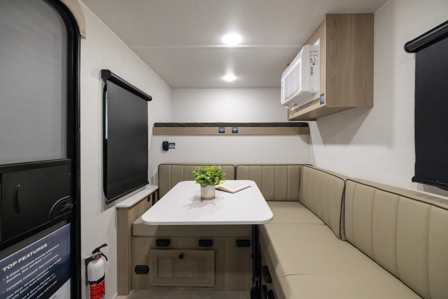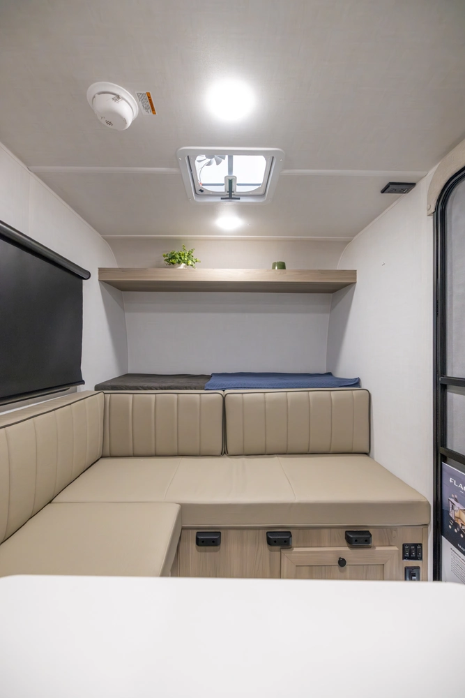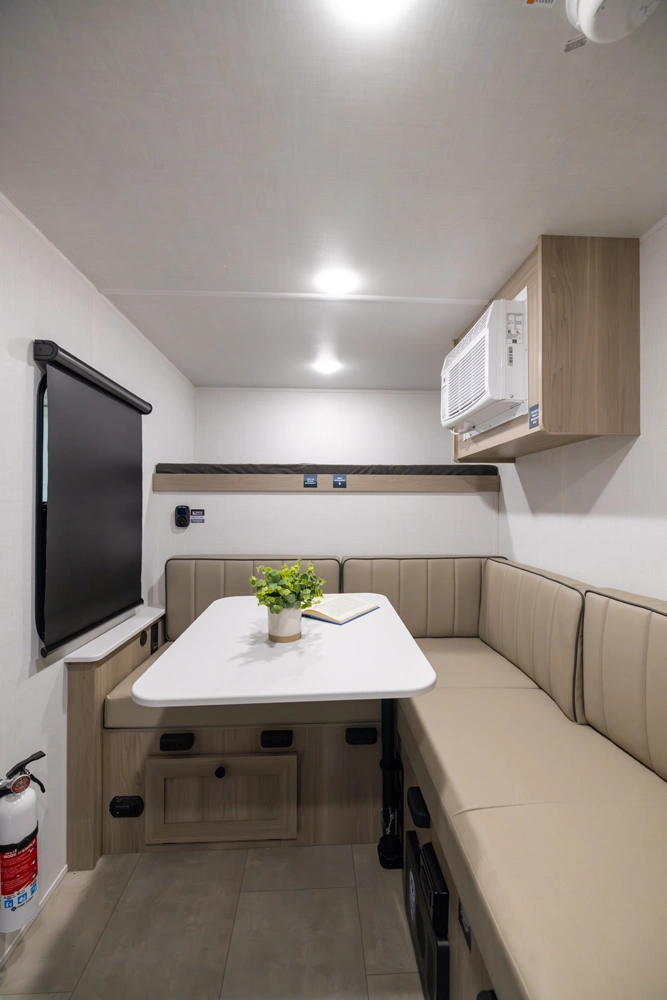 The E-Pro 11LE is an affordable lightweight camper designed for simple, practical camping. Built with aluminum framing and vacuum bonded walls and roof, it delivers durability without adding unnecessary weight. Inside, the massive 54" x 91" U-shaped dinette converts into a spacious sleeping area, while two interior bunks provide additional sleeping space. A convenient rear outdoor kitchen makes cooking at the campsite simple and easy.