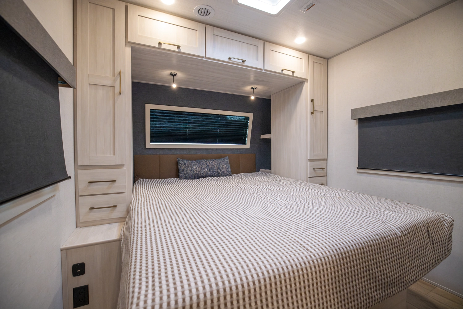 Sleeps 6. Tow vehicle 6800 lbs. minimum. No roughing it in this top selling model with walk in pantry, cook up a feast with sizable countertop space w/extension, and beautiful Barn Door concealing a big rear bathroom. Go down any road knowing you have the best in class nights rest coming in your master suite; “Cubbie” storage, large wardrobes, cavernous OH, drawers, USB’s, massive under bed storage. To top it off we added an outside kitchen!