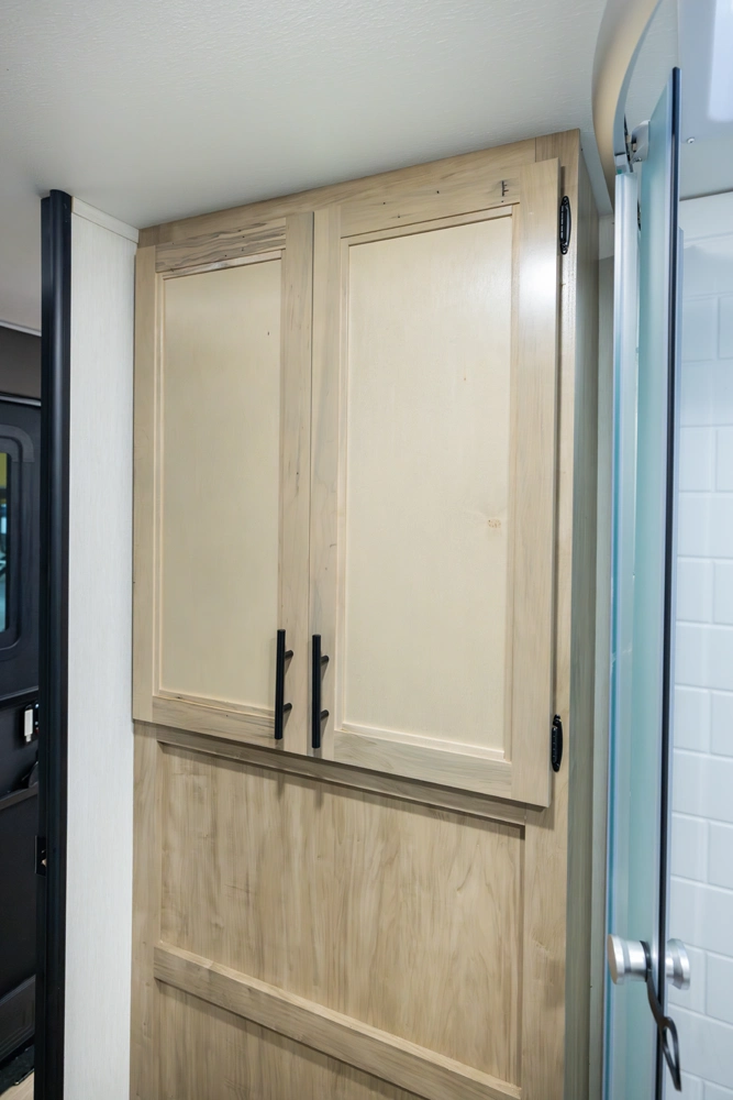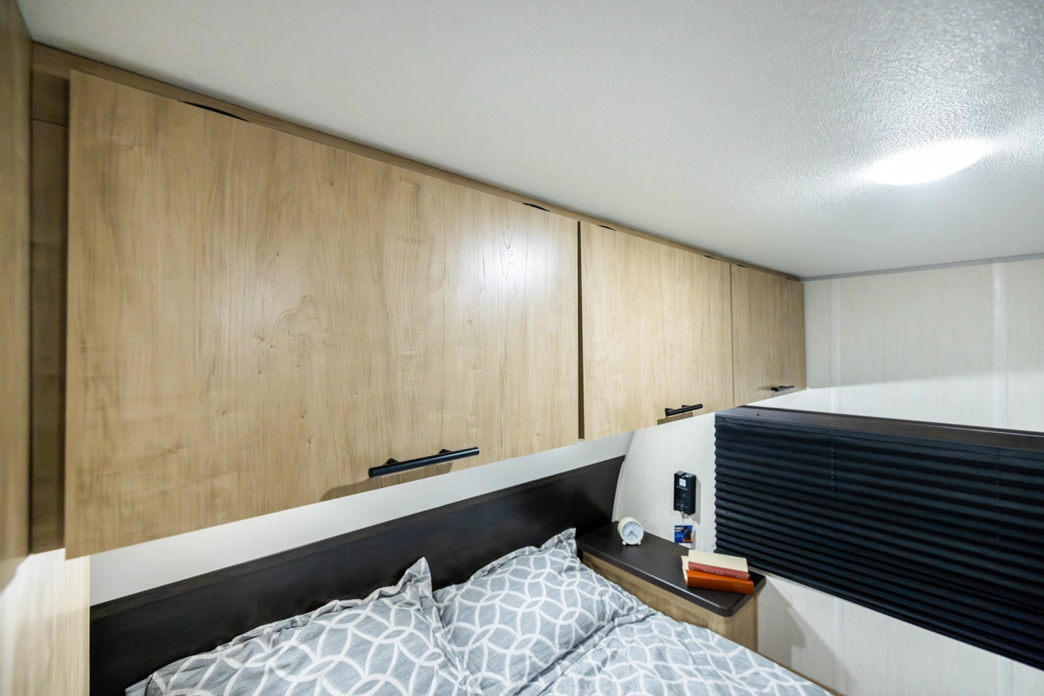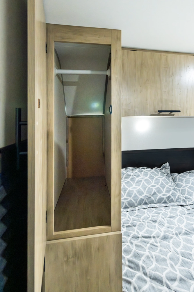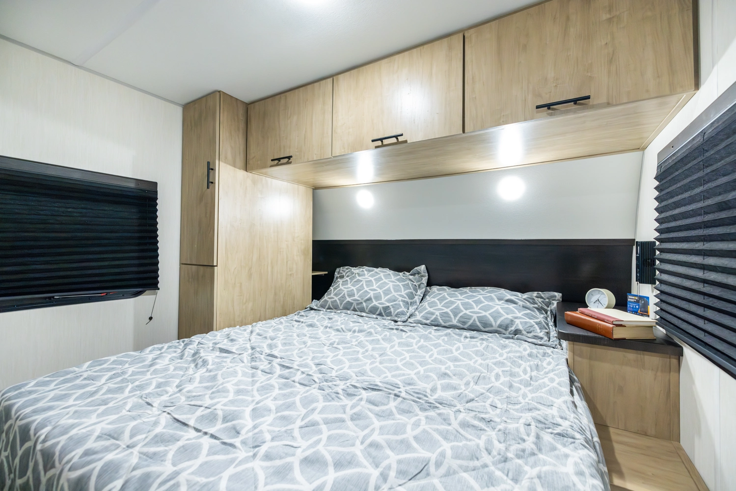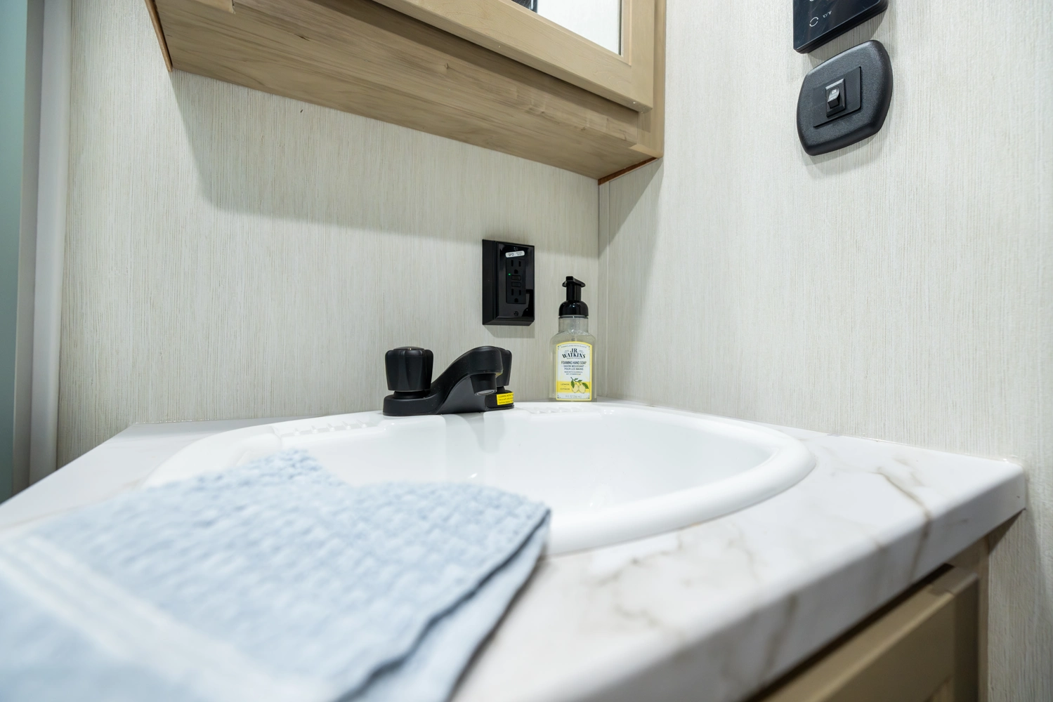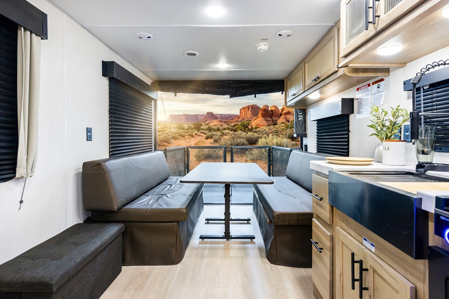 The Grey Wolf Toy Hauler by Forest River is the perfect RV for outdoor enthusiasts. The spacious garage can accommodate your toys, while the outdoor kitchen, shower, and patio area provide the ultimate outdoor living experience. Inside, you'll find a luxurious bedroom with a walk-around queen bed and a well-appointed bathroom. The modern kitchen, with its black stainless steel farm sink and sink cover, is perfect for cooking and entertaining.