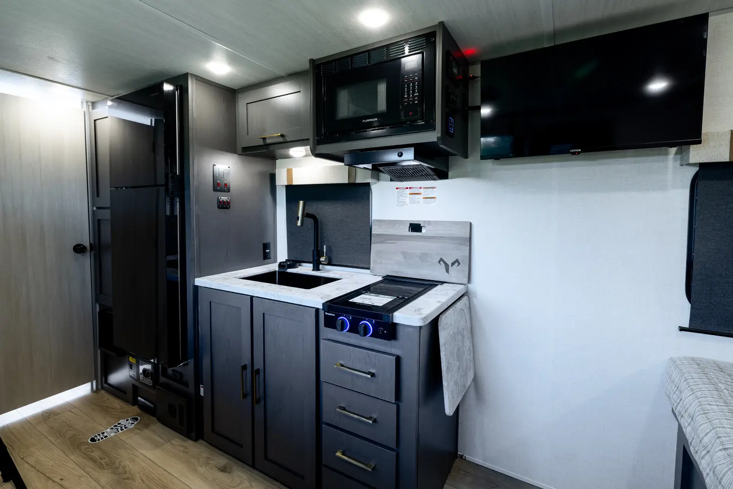 The Black Canyon Beast Mode Package elevates the experience across the board. Featuring the CURT independent suspension system, 400W of solar, a 2000W inverter, a fresh water filtration system, and a MaxxAir roof vent cover, Beast Mode provides a smoother ride, improved durability, enhanced comfort, and long-term reliability.