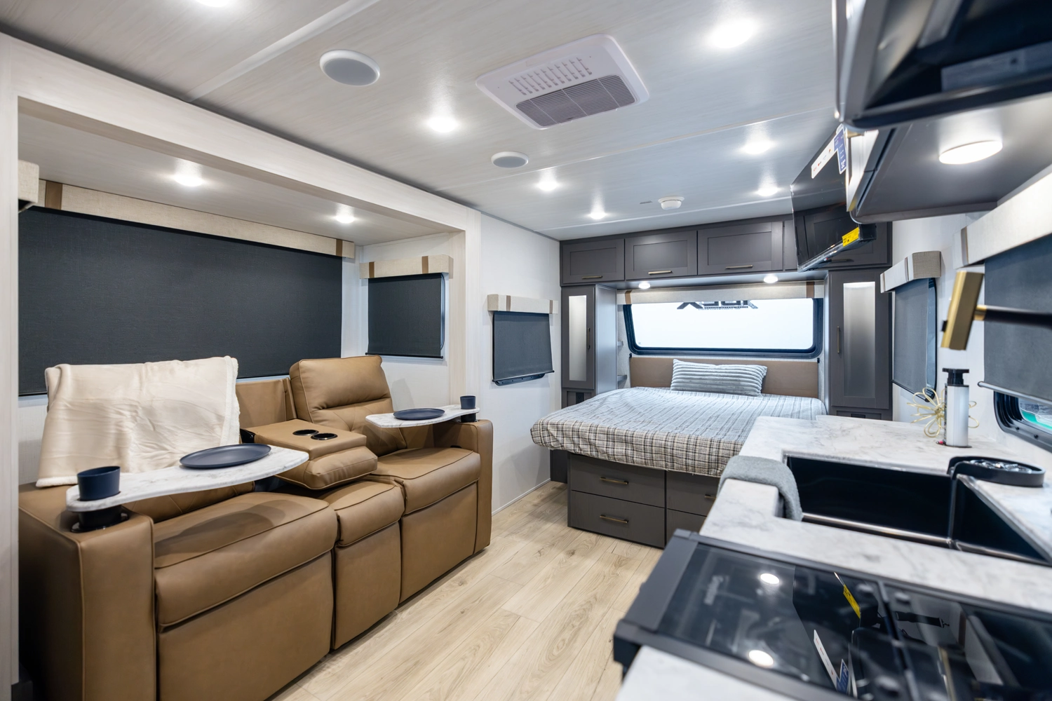 The 19QRB is a feature-rich, tow-friendly travel trailer that blends comfort, function, and durability. A front queen bed provides a cozy retreat with ample storage, while the central kitchen, complete with a large fridge and air fryer microwave to make meal prepping effortless. The slide-out sofa adds spacious comfort for relaxing or entertaining, and the rear bath features an upgraded shower and high-power fan. Built for extended-season use, the 19QRB is ready for adventure.