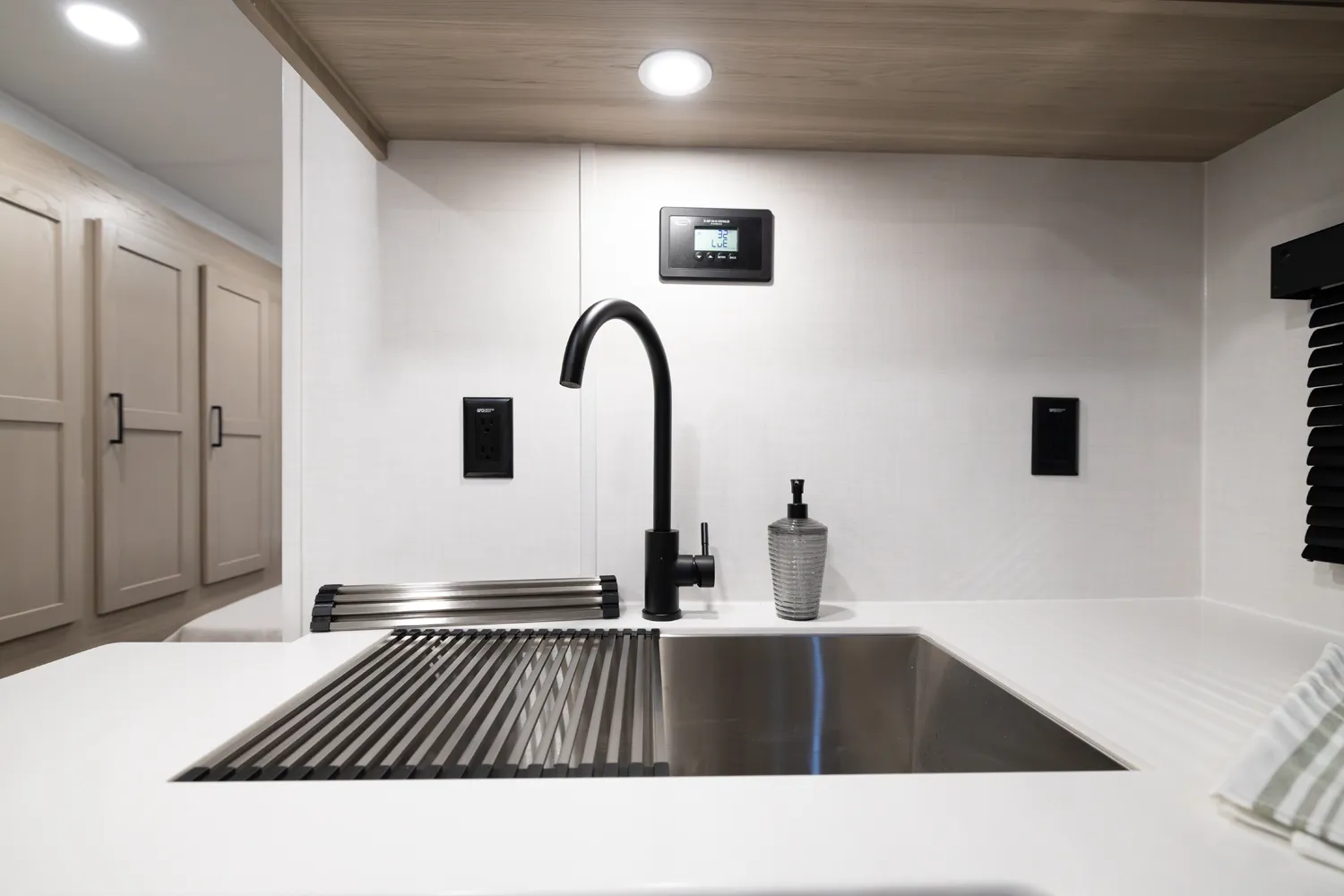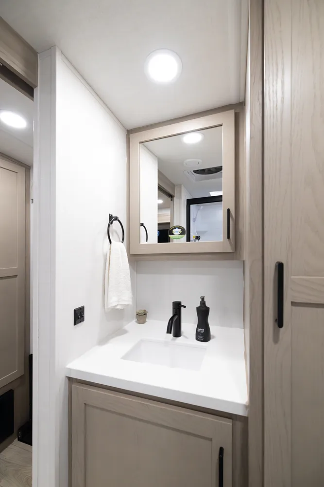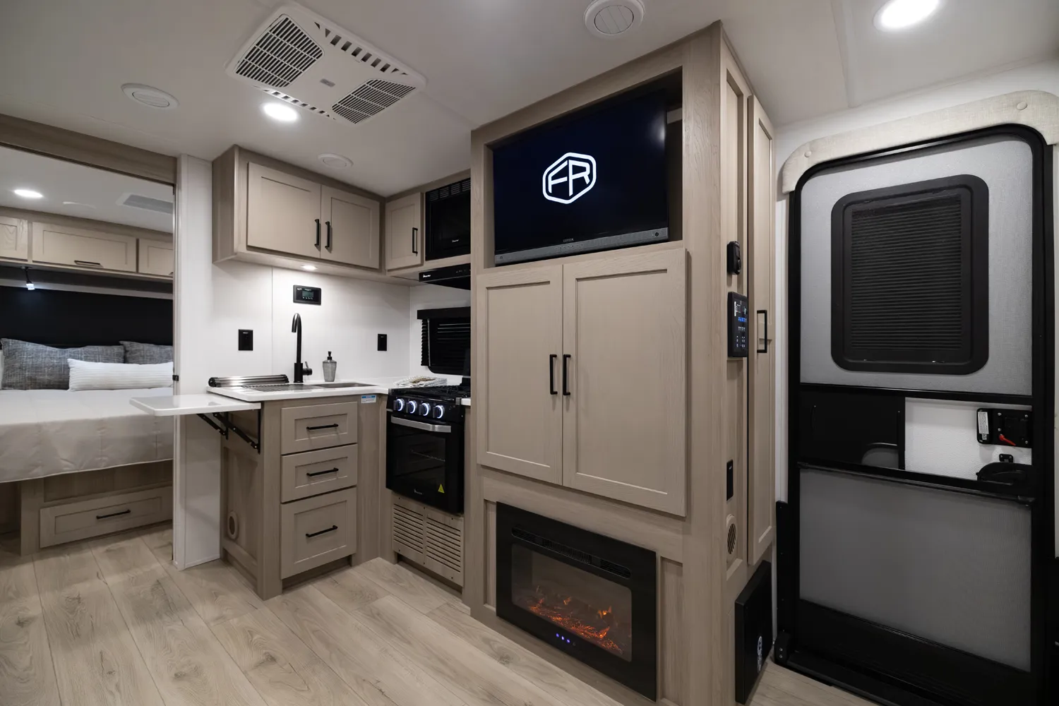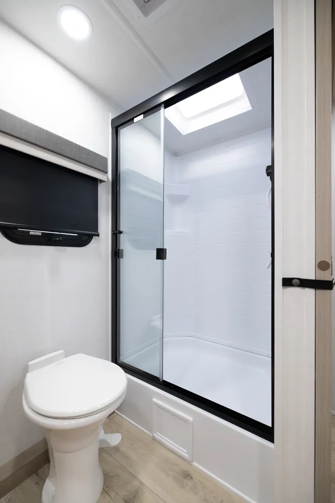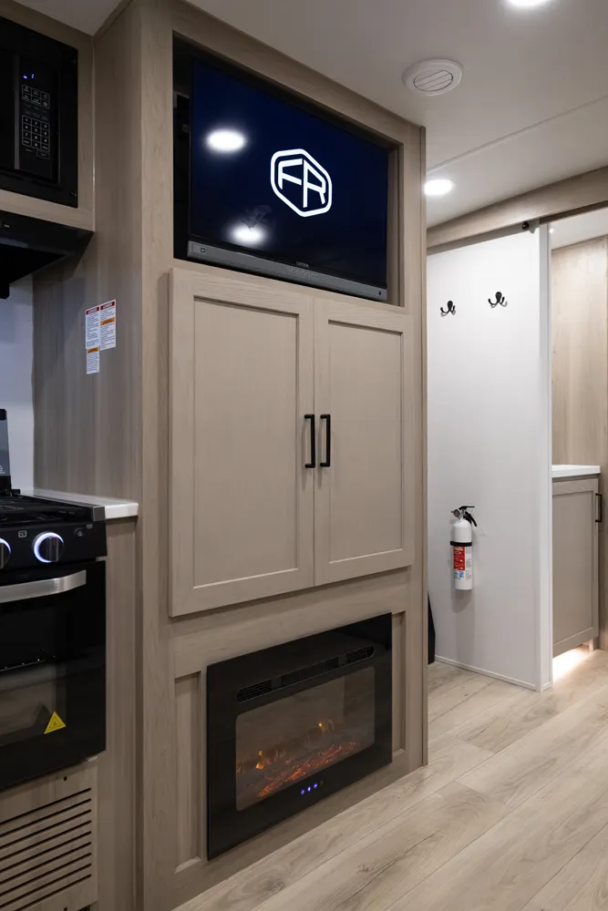 This unit is unique with its big 36" sliding doors leading to the bathroom and bedroom. These doors make moving around for a broad-shouldered person easier and comfortable. The entertainment center is loaded with 32" tv, a residential-style soundbar and a fireplace space heater. Across from this lovely entertainment center is a 72" theatre seating which is perfect for reclining and watching a good movie.