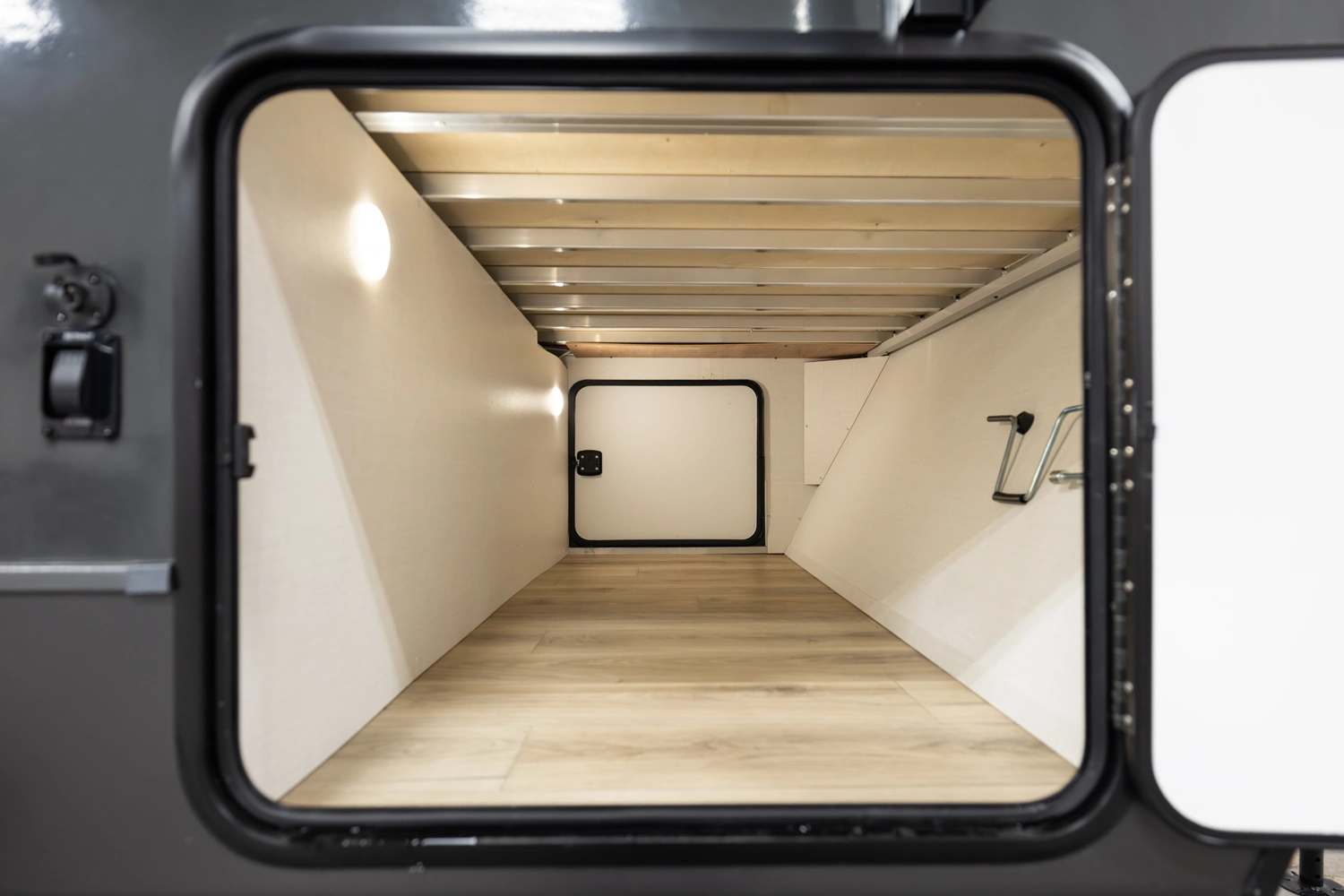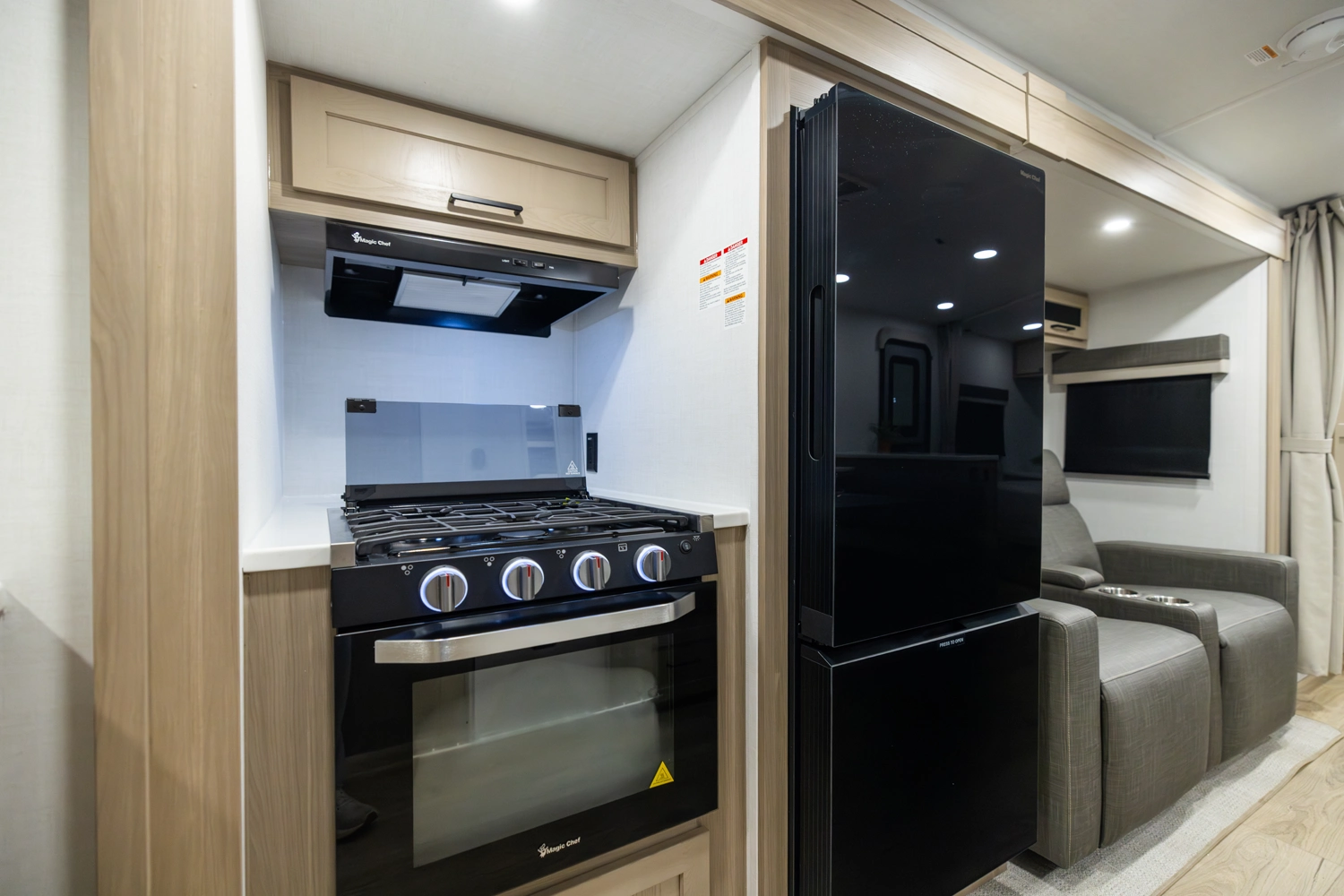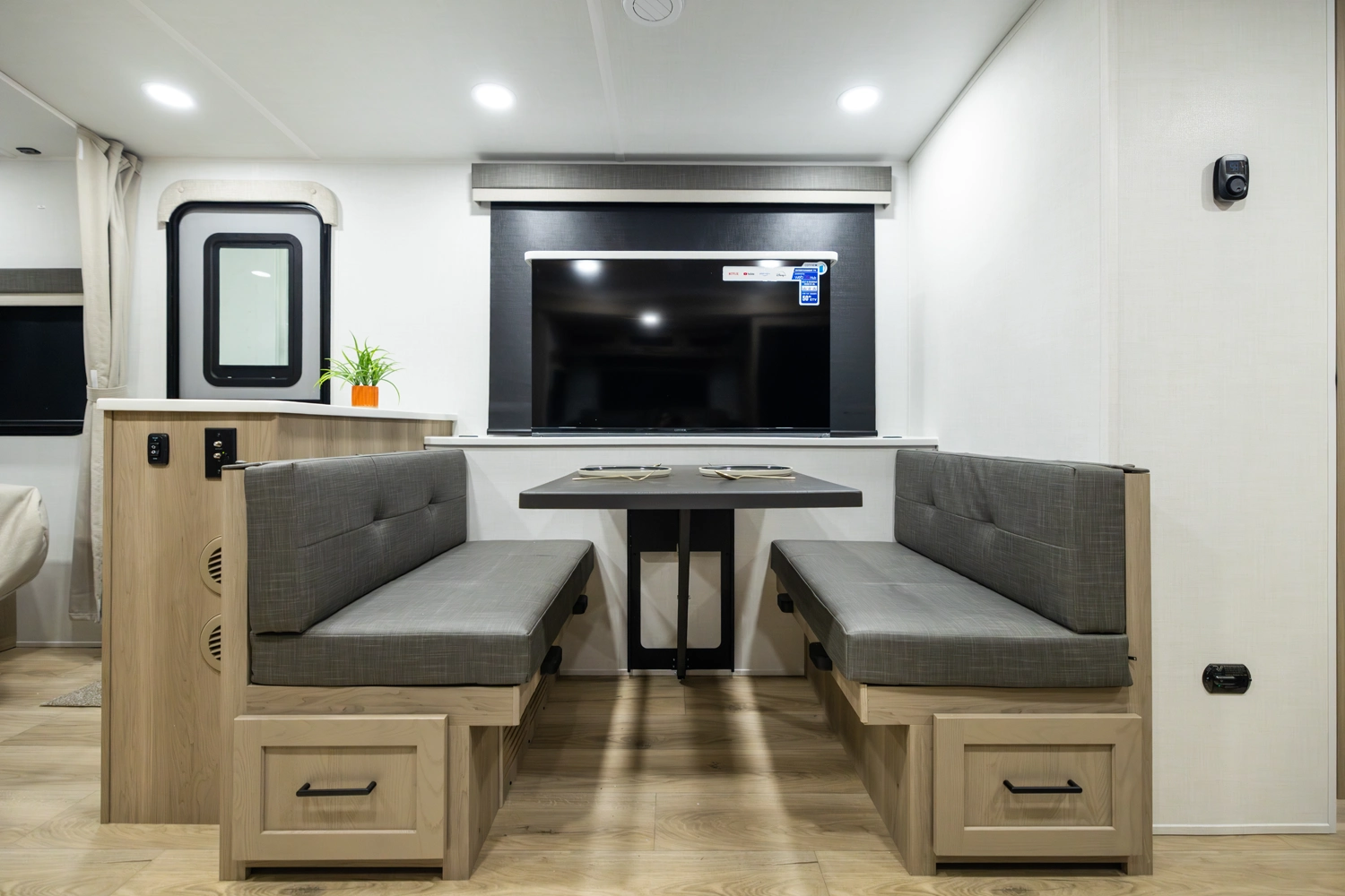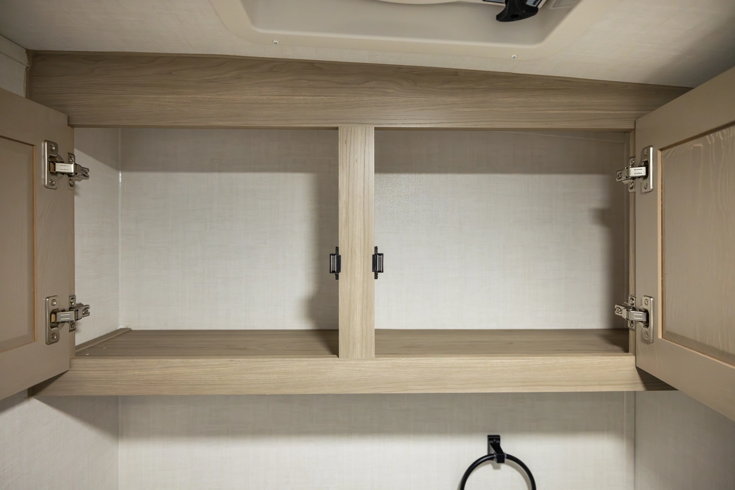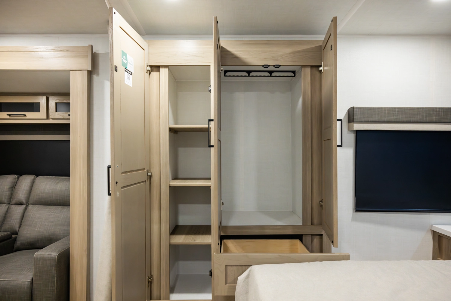 The 2522FB is a beautiful front bedroom floor plan featuring a unique wardrobe/pantry slideout for exceptional storage and organization. The living area includes theater seating directly across from the adjustable “televator” which raises for TV viewing and lowers so you can enjoy the massive door side window views. A versatile dinette and spacious rear kitchen with plenty of counter space completes the thoughtful design.