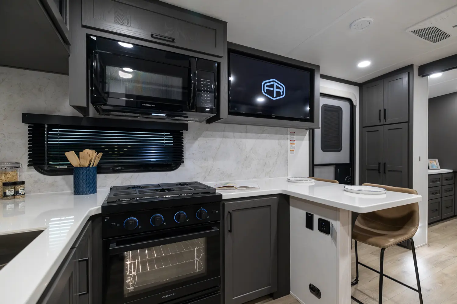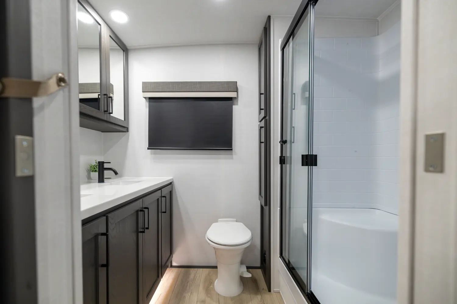 The two person bar top seating and a large window in the front give this coach an open feel with the ability to see your campsite. The theater seating is directly across the entertainment center for easy viewing and comfort. The bedroom in this unit is the game changer with a king bed in a slide out, a large wardrobe and dresser in the middle of this bedroom is perfect. A bathroom with a double sink vanity and 48” x 30” shower with a seat make this bathroom truly a master.