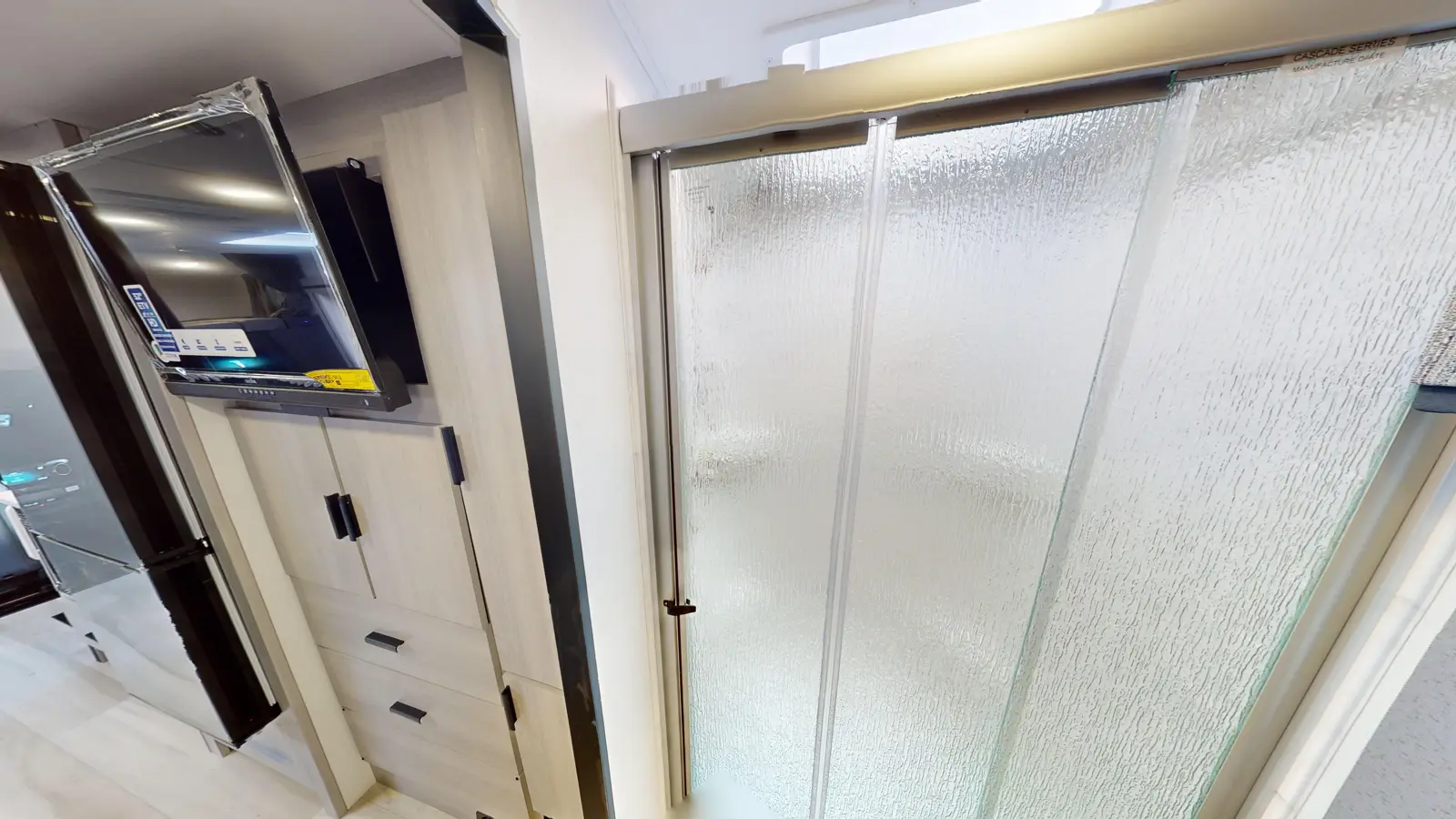 The Solera 24SRB is built on the Mercedes-Benz Sprinter 3500 chassis. It features a unique Murphy Bed in the central living area to maximize available space, in a slideout that provides even more elbow room. The kitchen area is fully equipped for meals on the go, with a 10.7 cu ft 12V refrigerator, recessed 2-burner range with flush glass cover, and a 1.3 cu ft convection microwave oven. Overhead cabinets and a dedicated closet, plus hidden drawers behind the TV, provide ample storage. The bathroom takes up the rear wall of the unit and includes a 24" x 36" shower, commode, sink with medicine cabinet, plus a linen closet.