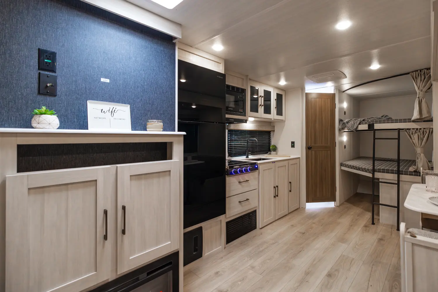 This 33' 4" travel trailer features a front queen bed, a convertible U-shaped dinette, and a rear corner bunkhouse with a ladder-accessible top bunk. The kitchen includes a 10 cu. ft. 12V refrigerator, oven, and stovetop. Exterior amenities include a 19' electric awning, outdoor camp kitchen, and a hot & cold spray port.