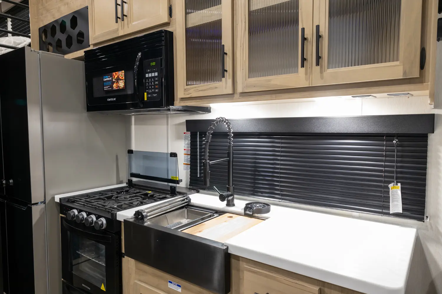• Cherokee Black Label Timberwolf (Deep Tinted Frameless Automotive Glass Windows, High Gloss Gel Coat Exterior Sidewalls, Multicolor Reading Lights, Pillowtop Mattress Upgrade, Thermo Foil Arctic Insulation, Wall Controlled Power Shades for Living Room and Kitchen)
