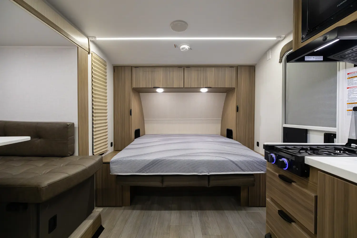 The 178BHSK is packed with features and weighs in at less than 4,000 lb. The unique front queen bed flips up to create additional seating space during the day. The kitchen slide provides extra room for the ever-popular U-dinette and includes a panoramic window. The rear bunkhouse gives you double over double bunks for additional flexibility and comfort, while the outside kitchen gives you additional options for mealtime and entertaining.